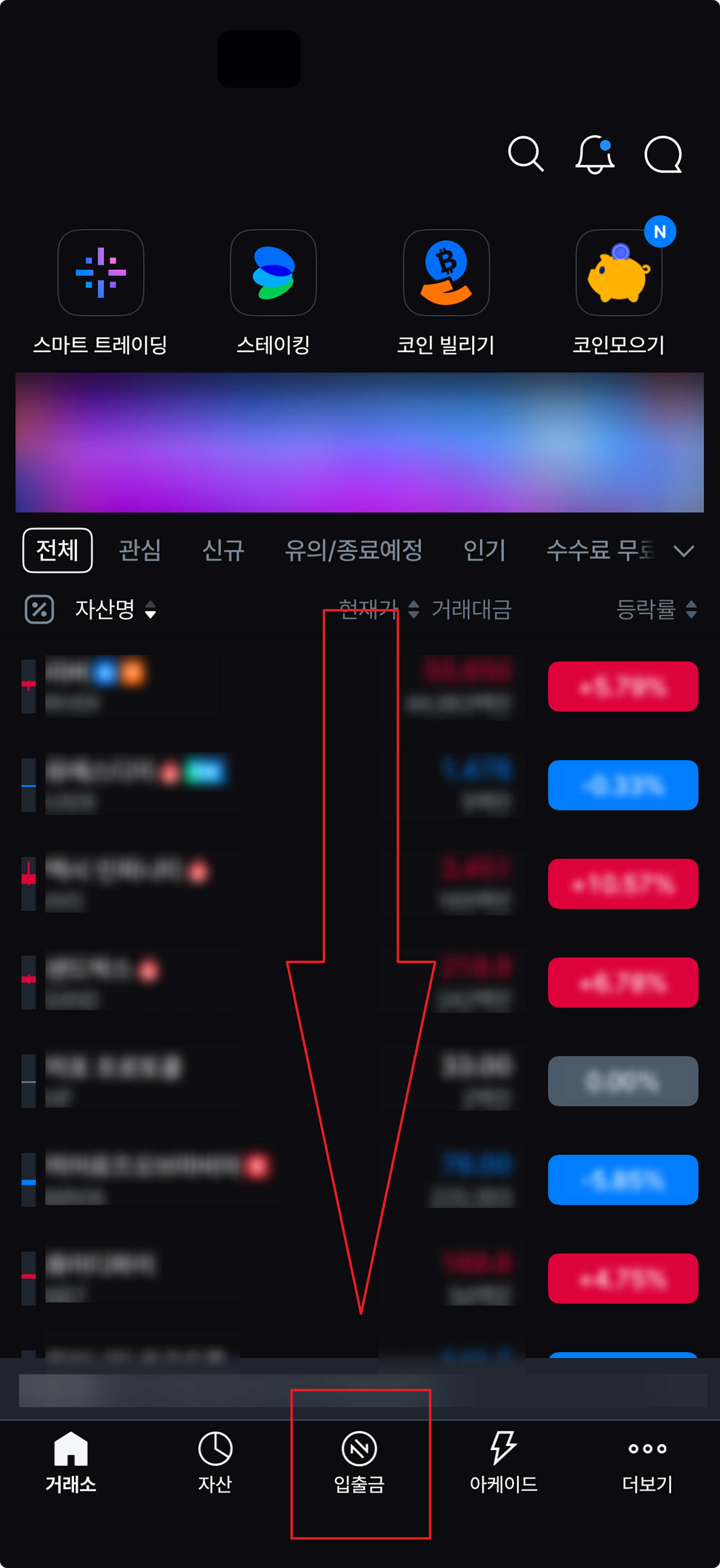 2. 메인화면 하단메뉴에 (입출금) 클릭합니다.