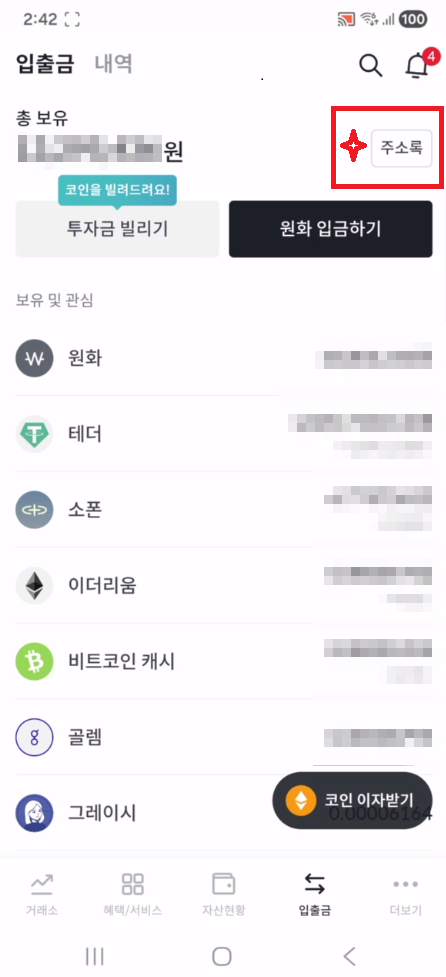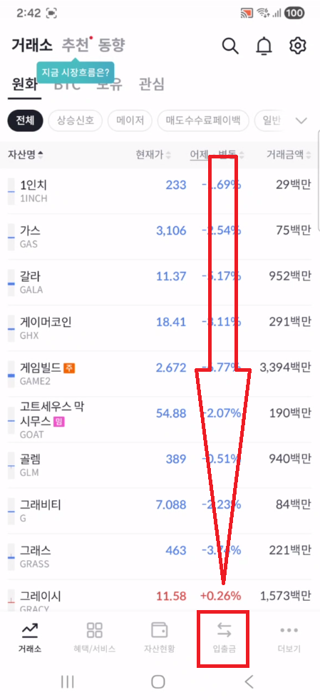 2.메인화면 하단메뉴에 (입출금) 클릭합니다.
