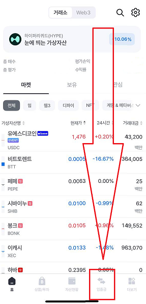 2. 메인화면 하단메뉴에 (입출금)을 클릭합니다.