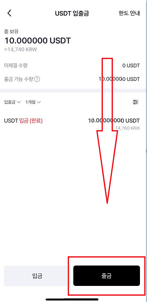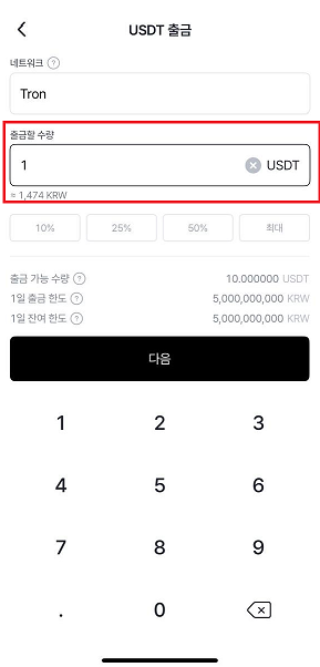 4. 출금수량에 1 입력하고 다음 클릭합니다.